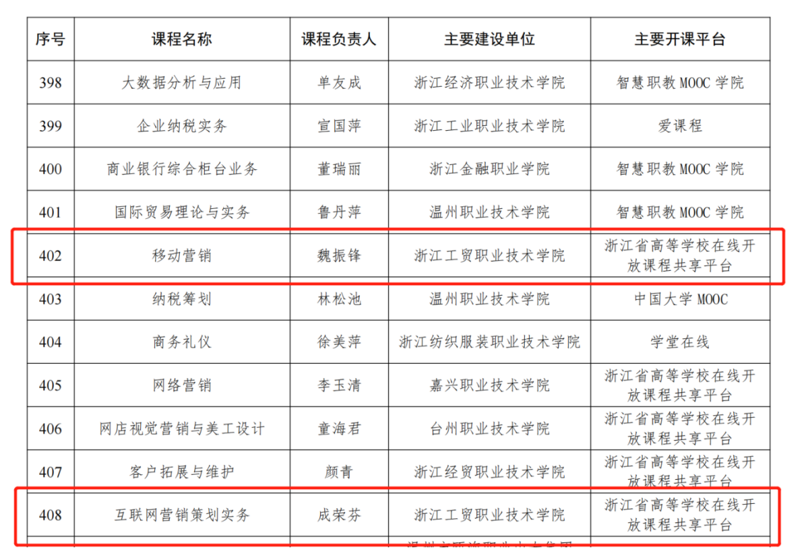 近日,教育部职业教育与成人教育司公示了2022年职业教育国家在线精品课程名单,我校《移动营销》、《互联网营销策划实务》、《数据库应用技术(MySQL)》、《大学生创业基础》等4门课程成功入选。
