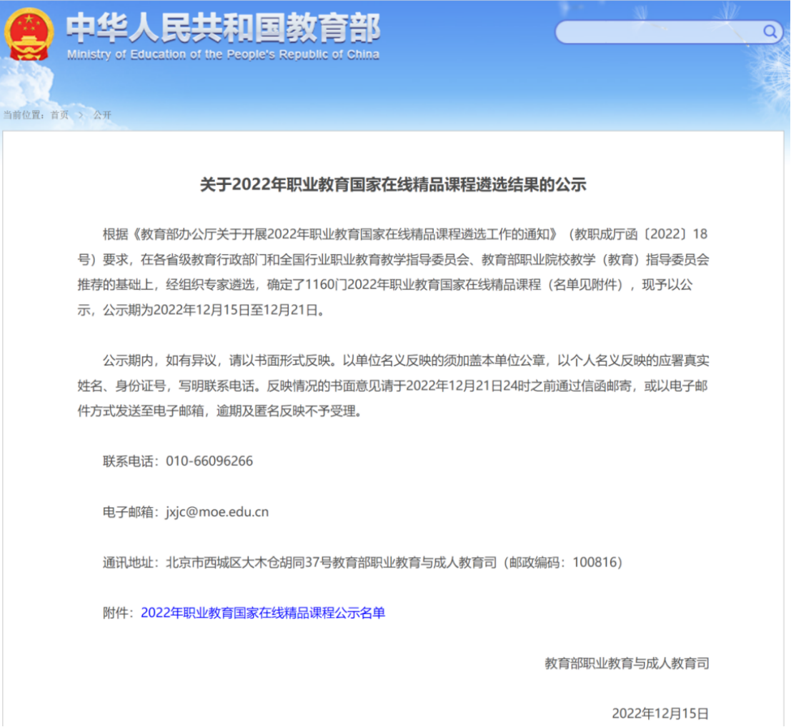 喜报!我校4门课程入选2022年职业教育国家在线精品课程