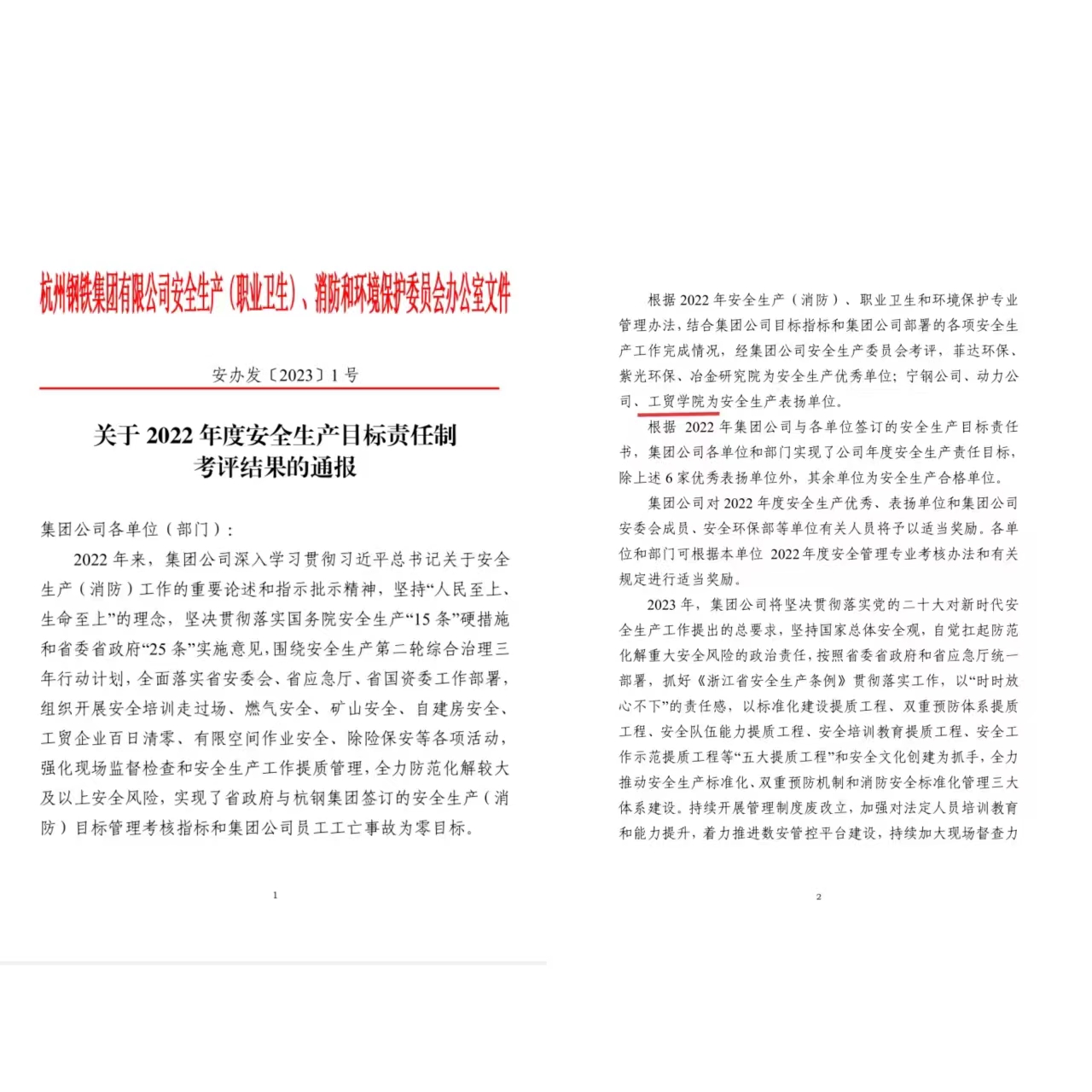 喜报!学校荣获杭钢集团2022年度安全生产表扬单位